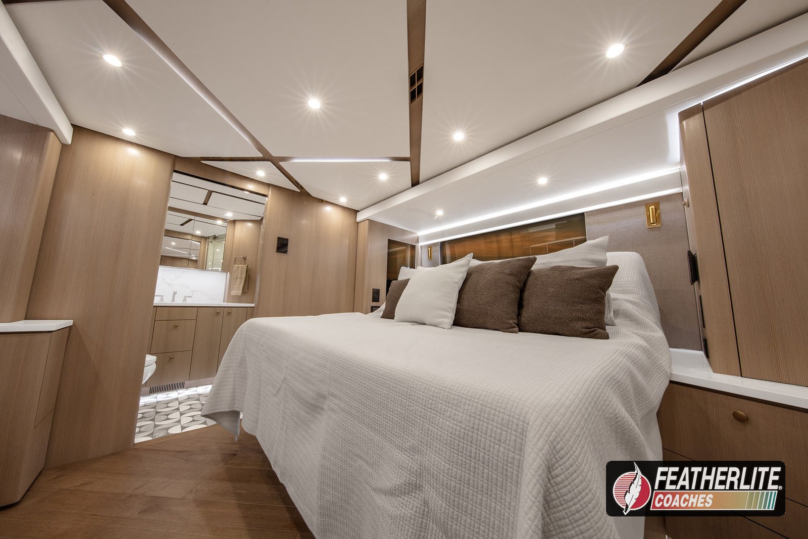 A concealed LG OLED UHDTV paired with a Sonos sound system completes the suite - making it equally fit for movie nights or morning stillness. Every detail, from the lighting to the stitching, speaks to the craftsmanship and thought Featherlite builds into rest as much as road-readiness.